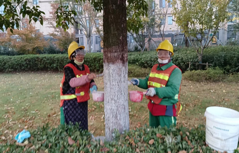 綠化樹木涂白是園林綠化養(yǎng)護(hù)作業(yè)工作中一項(xiàng)重要內(nèi)容,涂白主要采用石灰、硫酸銅和水混合而成,可以有效減少對(duì)綠化樹木水分的蒸發(fā),增加綠化樹木的抗凍、抗病、抗蟲的機(jī)理功能,同時(shí)具備防護(hù)、殺菌、殺蟲的多重作用。為提高綠化樹木涂白的整體質(zhì)量和視覺(jué)效果,綠化養(yǎng)護(hù)工人采用“拉線涂白法”或“立桿涂白法”,保證涂白上口齊平、高度一致、涂刷均勻,確保綠化苗木涂白后效果與環(huán)境形成美化作用。