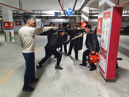 與此同時,應(yīng)急處置崗隊員也攜帶防暴盾牌、橡膠棍等專業(yè)器械火速集結(jié),以最快速度抵達(dá)地下車庫指定區(qū)域。面對負(fù)隅頑抗的 “盜竊分子”,隊員們沉著冷靜,憑借日常訓(xùn)練形成的默契配合,迅速結(jié)成戰(zhàn)術(shù)小組,從不同方向?qū)?“盜竊分子” 實施包圍,果斷出擊、動作規(guī)范,僅用數(shù)分鐘便成功將其治服,并移送公安機(jī)關(guān)處理。
